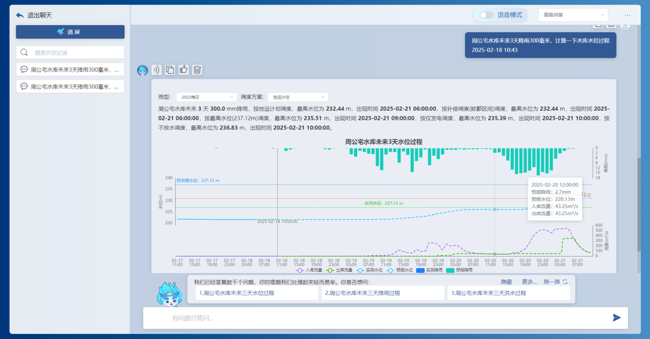 基于前端感知的降雨、水位、流量、工程運(yùn)行等實時信息,借助DeepSeek大模型和“甬水院智算”算法庫,能夠?qū)崟r對流域防汛形勢進(jìn)行快速分析,包括降雨形勢、水情預(yù)警、預(yù)泄分析、水庫納蓄分析等,可以按照規(guī)定的表單形式一鍵輸出成果,為防汛防洪工作提供兼具前瞻性、科學(xué)性、精準(zhǔn)性、安全性的決策支撐。相關(guān)學(xué)術(shù)成果曾以《基于大模型的水利防汛智能問答關(guān)鍵技術(shù)研究與應(yīng)用探索》為題于去年8月的第七屆城市水安全與水管理學(xué)術(shù)交流會作專題匯報。