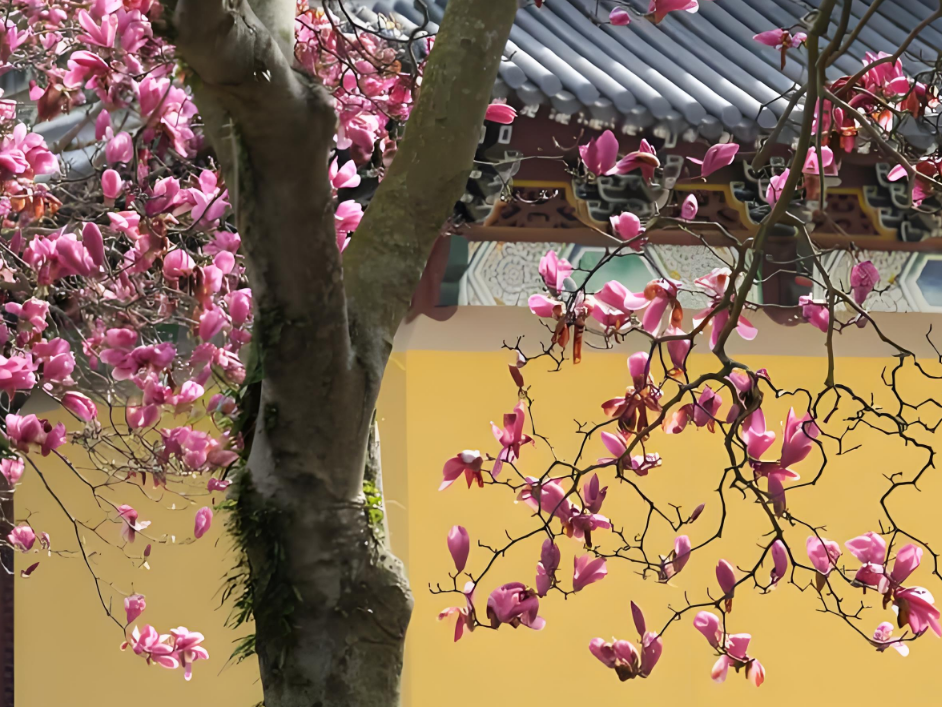 早上8:45,大巴準(zhǔn)時(shí)從園區(qū)啟程,在陽(yáng)光明媚中駛向?qū)幉ㄏ笊綁︻^鎮(zhèn)舫前村。抵達(dá)智門(mén)禪寺時(shí),茶園環(huán)繞,竹海綿延,百年紫玉蘭正值花期。大家或駐足欣賞古剎花影,或在禪寺咖啡館品鑒特色飲品,于傳統(tǒng)與現(xiàn)代交融中開(kāi)啟這一天的芳菲之旅。