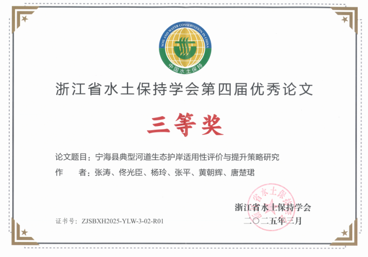會(huì)議現(xiàn)場通報(bào)了2024年度生產(chǎn)建設(shè)項(xiàng)目水土保持方案優(yōu)秀單位、2024年度生產(chǎn)建設(shè)項(xiàng)目水土保持監(jiān)測(cè)優(yōu)秀單位,并為獲獎(jiǎng)集體進(jìn)行表彰。隨后,又現(xiàn)場表彰了浙江省水土保持學(xué)會(huì)第四屆優(yōu)秀論文評(píng)選結(jié)果。我院榮獲2024年度生產(chǎn)建設(shè)項(xiàng)目水土保持方案優(yōu)秀單位、2024年度生產(chǎn)建設(shè)項(xiàng)目水土保持監(jiān)測(cè)優(yōu)秀單位兩項(xiàng)集體榮譽(yù),并且以論文《寧海縣典型河道生態(tài)護(hù)岸適用性評(píng)價(jià)與提升策略研究》獲得浙江省水土保持學(xué)會(huì)第四屆優(yōu)秀論文三等獎(jiǎng)。