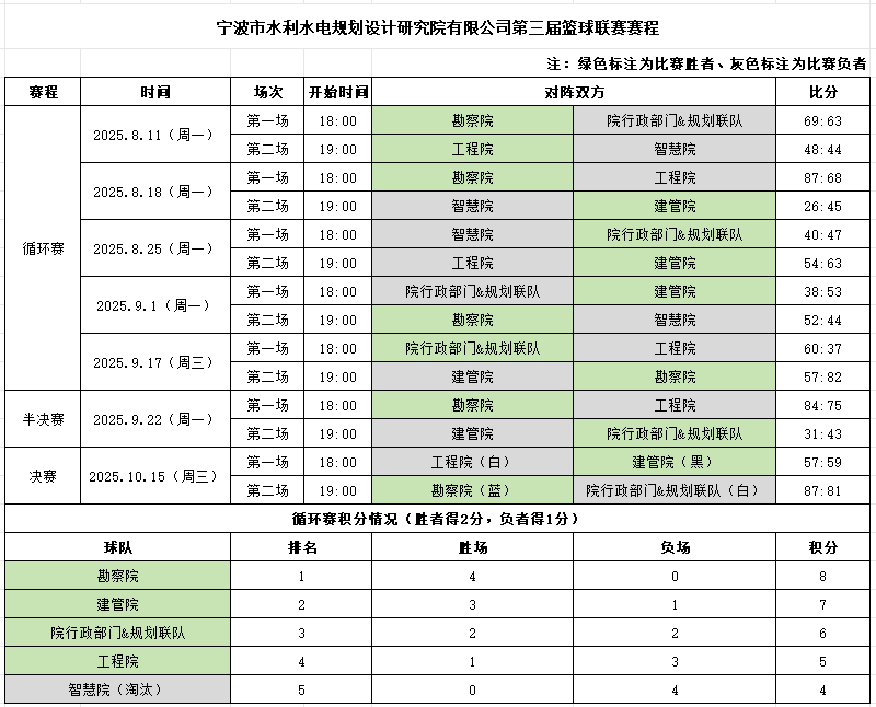 八月盛夏,激情點(diǎn)燃。寧波市水利院第三屆"智慧杯"職工籃球聯(lián)賽在集士港體育公園籃球場火熱開幕!這不僅是一場競技的較量,更是一次寧波院人團(tuán)結(jié)拼搏、斗志昂揚(yáng)的集中展現(xiàn)。經(jīng)過兩個(gè)月的鏖戰(zhàn),最終勘察院隊(duì)強(qiáng)勢問鼎冠軍,建管院隊(duì)與院行政部門&規(guī)劃聯(lián)隊(duì)分別獲得亞軍、季軍?,F(xiàn)在,就讓我們一同回顧這段充滿汗水與激情的籃球時(shí)光!