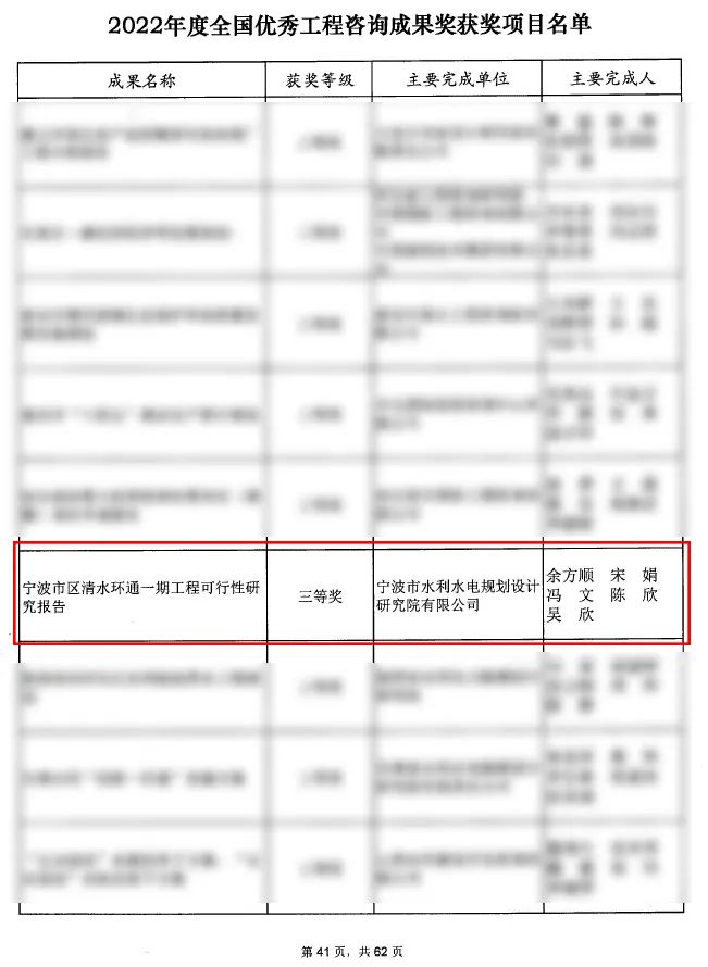 近日,中國工程咨詢協(xié)會(huì)公布2022年度全國優(yōu)秀工程咨詢成果獎(jiǎng)獲獎(jiǎng)項(xiàng)目名單,寧波市水利院申報(bào)的《寧波市區(qū)清水環(huán)通一期工程可行性研究報(bào)告》咨詢成果順利通過公示,榮獲2022年度全國優(yōu)秀工程咨詢成果三等獎(jiǎng)!該獎(jiǎng)項(xiàng)由中國咨詢工程協(xié)會(huì)組織申報(bào)評審,每兩年評選一次,是中國工程咨詢行業(yè)含金量最高的獎(jiǎng)項(xiàng)。